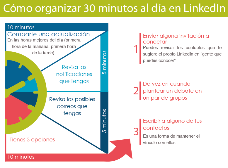 Ya te hemos recomendado dedicar unos 30 minutos al día a LinkedIn España. Mira una sugerencia de cómo organizarlos por si te es de ayuda: