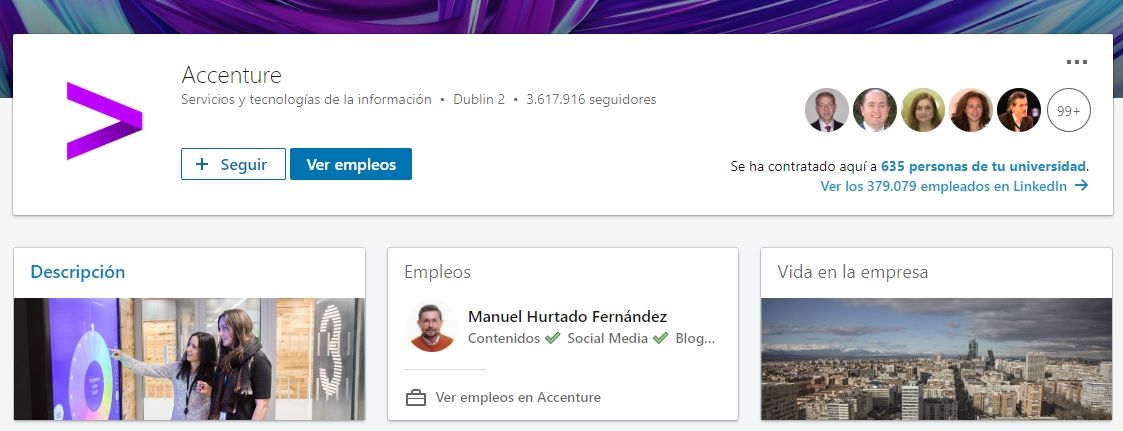 ► Este es el caso de Accenture, con más de 3.600.000 seguidores en su página, más de 379.000 empleados en LinkedIn, una sección de “Vida en la empresa” en la que apuestan por la inclusión y la diversidad, y unos contenidos visualmente muy atractivos (en los que el vídeo tiene lugar destacado).