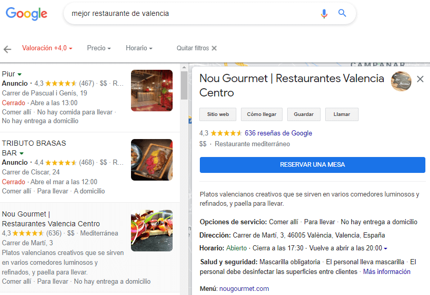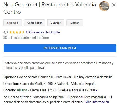¿Cuál es tu ficha de Google My Business? Es la ficha que aparece cuando alguien busca tu restaurante (o restaurantes en el área) en Google o Google Maps. Así es como se ve esta ficha: