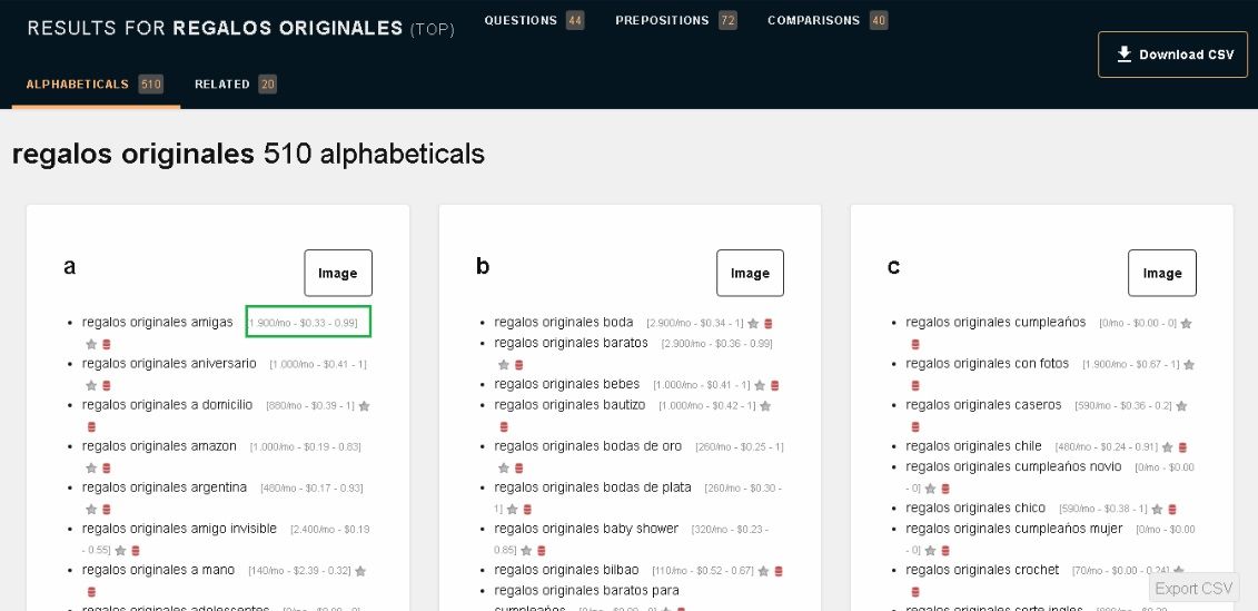Al presionar “Export CSV” se va descargar un archivo CSV que contiene toda la información que nos muestra la extensión en pantalla. Sin embargo esta opción sólo funciona cuando la utilizas en las SERPs, en otras aplicaciones de google como AdWords, Search Console, o en nuestro caso Trends, esta opción no hace nada.