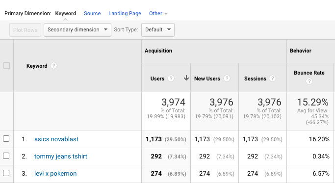 Para obtener las posiciones actuales de estas palabras clave, necesitas establecer las posiciones como una dimensión secundaria en Google Analytics, como se muestra en la imagen a continuación.
