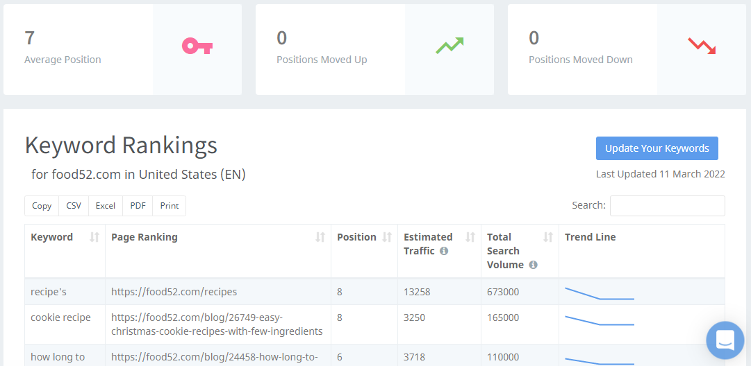 - También puedes exportar tus clasificaciones de palabras clave a un archivo de Excel, CSV y PDF que puedes compartir con tus clientes.