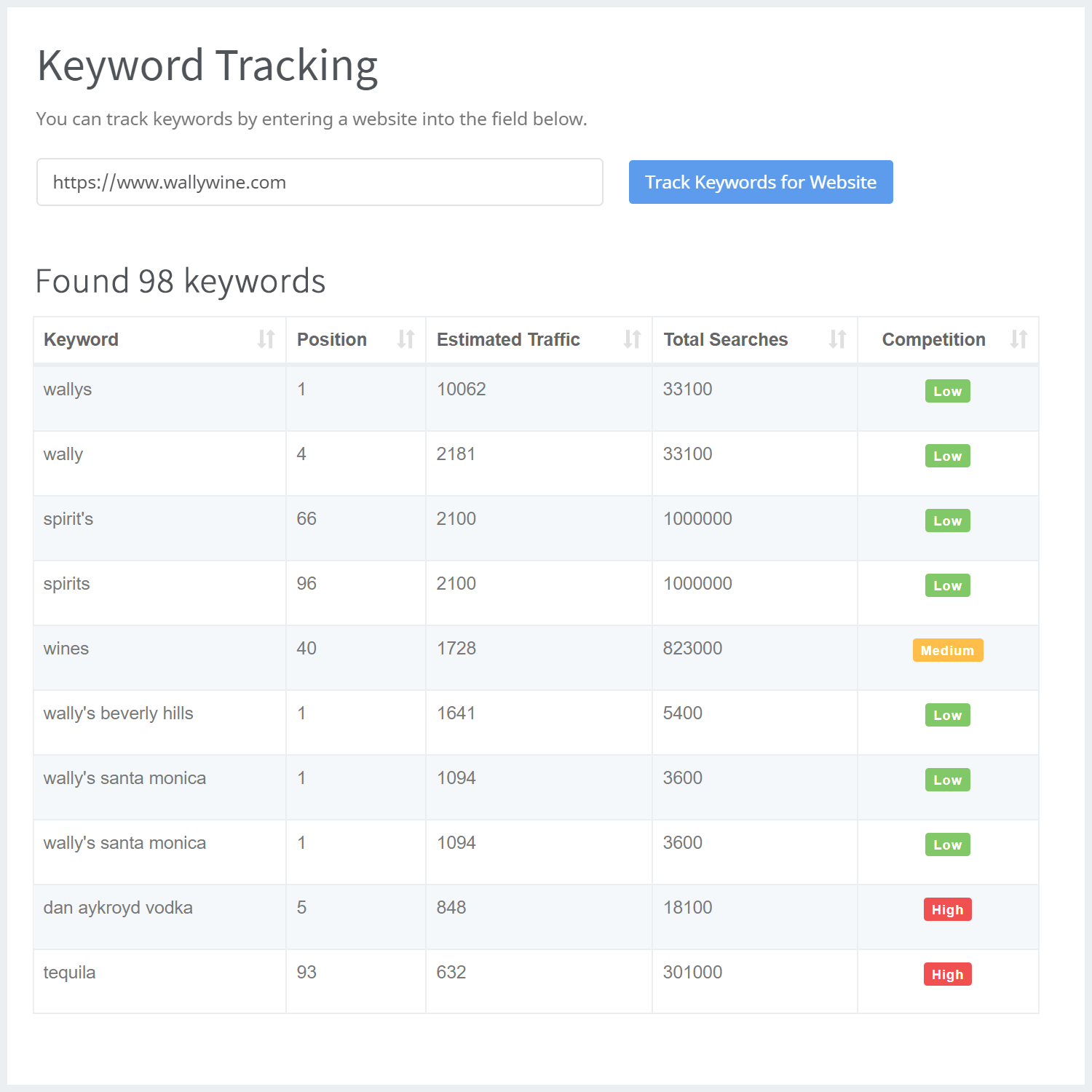 - Junto con las posiciones de clasificación, SEOptimer también muestra el volumen de búsqueda de la palabra clave, el tráfico estimado y la competencia o dificultad.