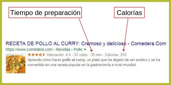 Si todavía no has incluido este tipo de datos en tu web, ponte con ello ya mismo porque es un factor que marca la diferencia. Tus snippets mejorarán visiblemente en los resultados de búsqueda, ofreciendo información complementaria. Son lo que llaman “rich snippets”. Aquí puedes ver un ejemplo para recetas y precios: