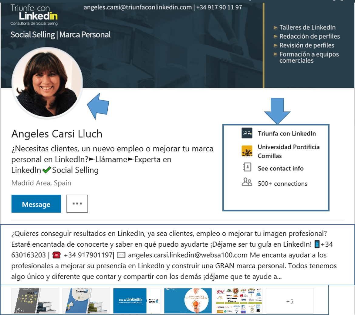 - Aparecen las miniaturas de los elementos multimedia que hayas añadido al extracto. Hasta 6. Esto es realmente muy importante porque son muy visuales y atraen la atención. Para mí, esto también podría ser un estímulo para ver el resto del extracto y de tu perfil LinkedIn. Recuerda que LinkedIn te permite añadir presentaciones, fotos, enlaces a sitios web, enlaces a vídeos, vídeos, etc..