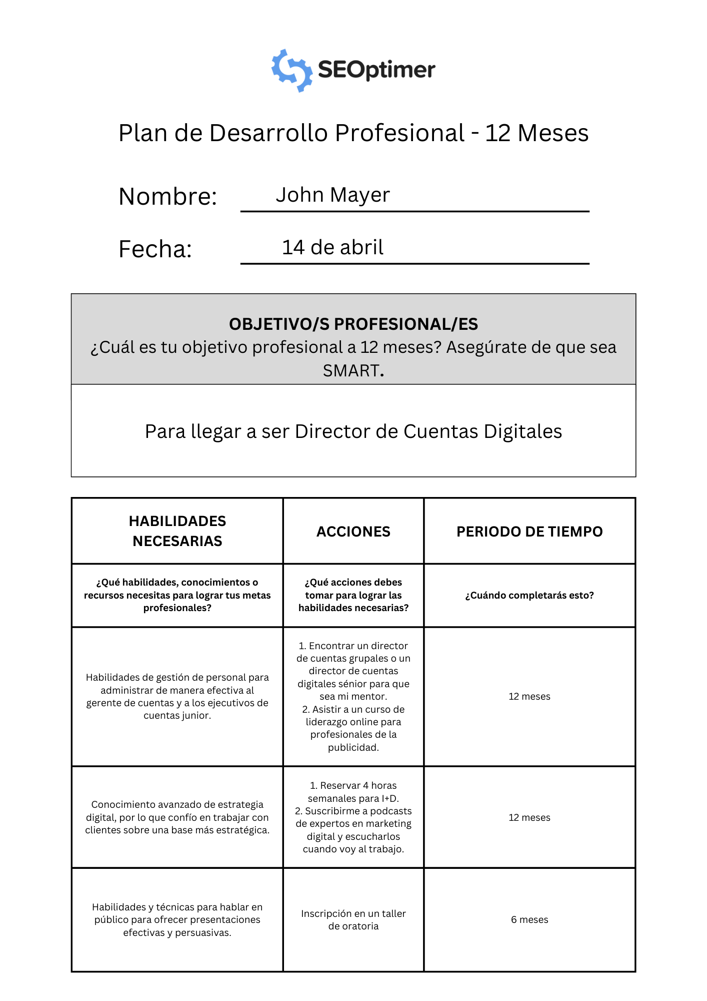 Si es necesario, muestra a los empleados algunos ejemplos de Plan de Desarrollo Profesional si no saben qué escribir. A continuación mostramos un ejemplo de PDP de un empleado que trabaja en una agencia digital. Se trata de un ejemplo de la plantilla “Versión simple”: