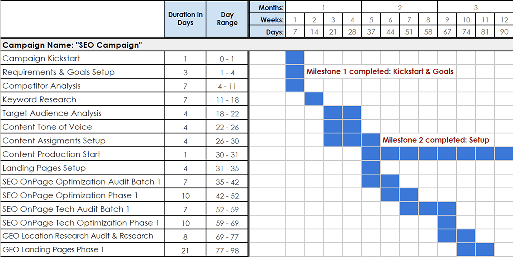 Al inicio de una relación con un cliente, los servicios de SEO pueden contener múltiples partes en movimiento concurrentes. Algunas de estas son tareas y arreglos únicos, mientras que otras pueden convertirse en procesos semanales o mensuales. Para capturar mejor el valor que estarás entregando a través de todo este trabajo, es mejor agrupar las tareas individuales en proyectos separados y planificarlos en una vista de cronograma como un calendario o un diagrama de Gantt: