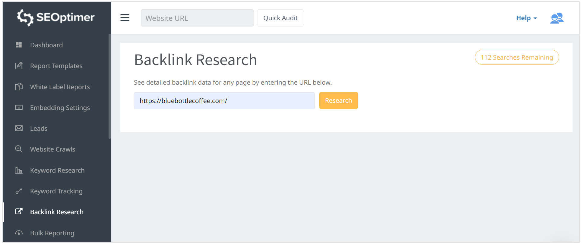Primero, inicia sesión en tu cuenta de SEOptimer y navega hasta el módulo de Investigación de Backlinks en el lado izquierdo de la página.