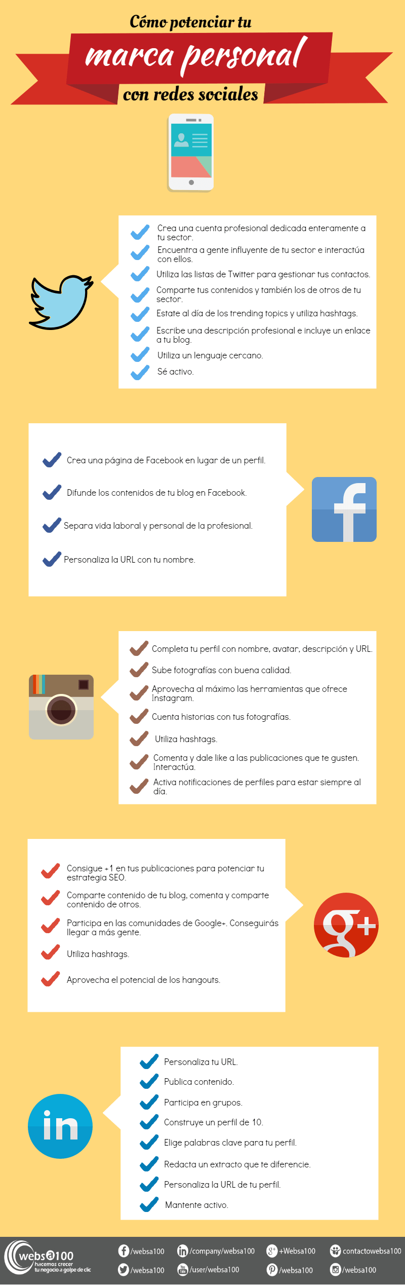Ya repasamos en su día los siete pasos básicos para crear tu marca personal, pero, una vez seguidos, ¿cómo potenciarlos con las redes sociales? ¿Qué puede aportarnos cada una de ellas? Al fin y al cabo, las redes sociales potencian cada vez más nuestra vida profesional, ya que son el mercado en el que los consumidores pueden descubrir y escoger los productos que somos nosotros mismos. Pero, ¿qué redes elegir? ¿Cuáles tienen más visibilidad? ¿Cuáles me pueden ayudar a cumplir de forma más eficiente los objetivos que me he propuesto? Te explicamos cómo usar correctamente las redes sociales más importantes para potenciar al máximo tu marca personal: