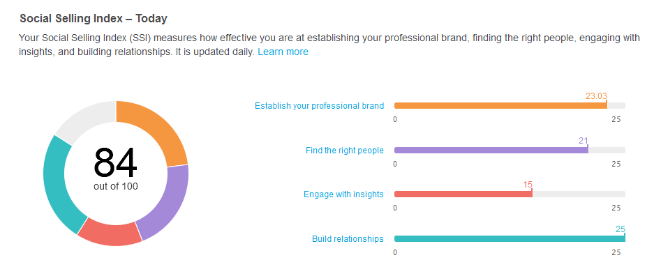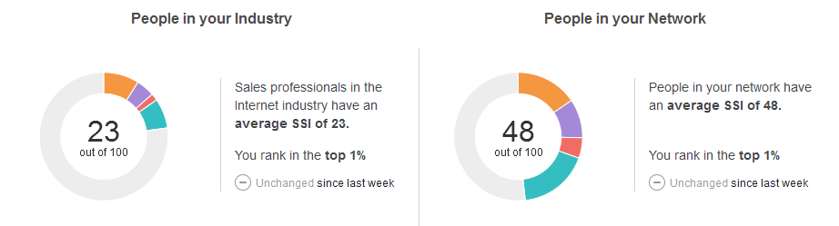 El índice SSI de LinkedIn se creó como una fórmula para cuantificar lo bien que un equipo comercial estaba aplicando el social selling en una escala del 1 al 100. Según LinkedIn, los "social sellers" (permitidme que use esta expresión aunque sea inglesa... me parece que en dos palabras dice mucho, si alguien tiene una alternativa en castellano que lo diga por favor) crean un 45% más de oportunidades que sus homólogos con un SSI inferior y tienen un 51% más de posibilidades de alcanzar sus objetivos comerciales. LinkedIn también declara que el 78% de los social sellers venden significativamente por encima que sus colegas que no usan las redes sociales.