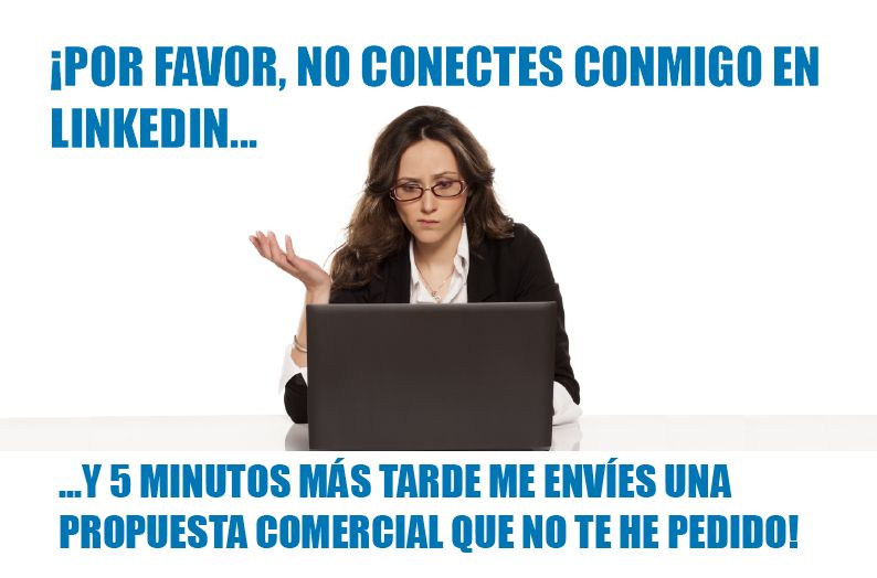 Uno de los comportamientos más indeseables para los usuarios de LinkedIn es recibir correos comerciales no deseados. O que nada más aceptar una invitación a conectar el contacto LinkedIn en cuestión empiece a "bombardear" con peticiones varias o presión comercial. No, no y no. En LinkedIn, al igual que en otras facetas de la vida, para recibir hay que dar previamente. Mi consejo (y sé que hay gente que no lo comparte) es que NO hay que ser abiertamente comercial a no ser que el contacto lo pida. NUNCA en la primera toma de contacto. Es como si vas a una convención repartiendo propuestas comerciales al primero que te da la mano para saludarte.