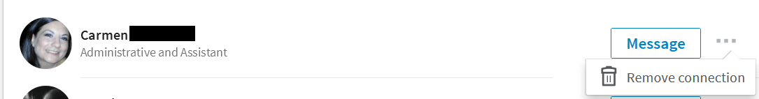 Con la nueva versión es mucho más fácil: ve a la sección "mi red", entra en "tus contactos" y verás la lista de todos. Puedes buscar por nombre en la lupa que hay en la esquina superior derecha. Cuando llegues al contacto LinkedIn a eliminar pulsa sobre los tres puntos que aparecen al lado del botón de mensaje y te aparecerá la posibilidad de eliminar a ese contacto. Solo puedes eliminar a contactos de primer grado.