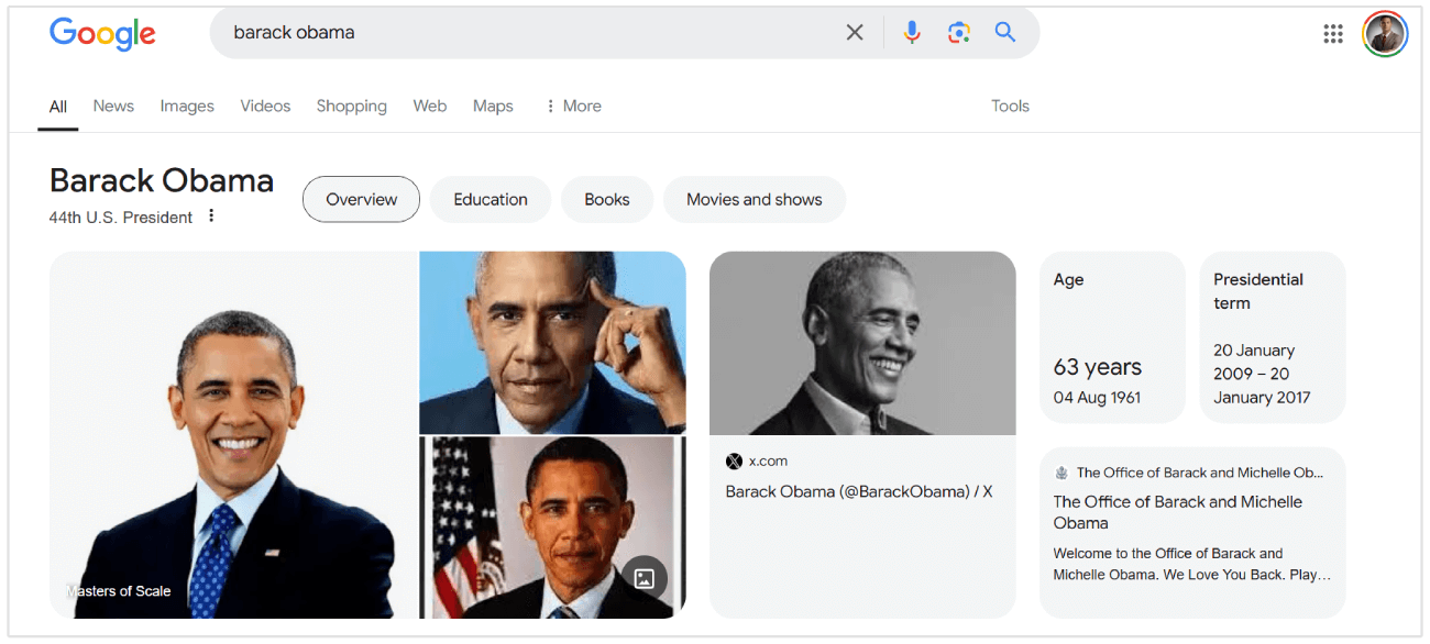 Por ejemplo, cuando buscas “Barack Obama,” Google sabe que él es: