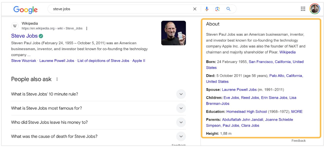 Esta es la razón por la que Google puede mostrar un "Panel de Conocimiento" con información relevante en lugar de solo listar páginas web con su nombre.