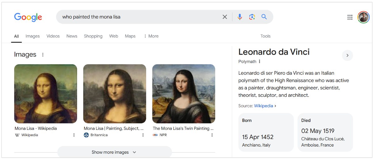 Por ejemplo, si buscas “¿Quién pintó la Mona Lisa?”, Google extrae la respuesta "Leonardo da Vinci" porque lo reconoce como una entidad vinculada a esa pintura.