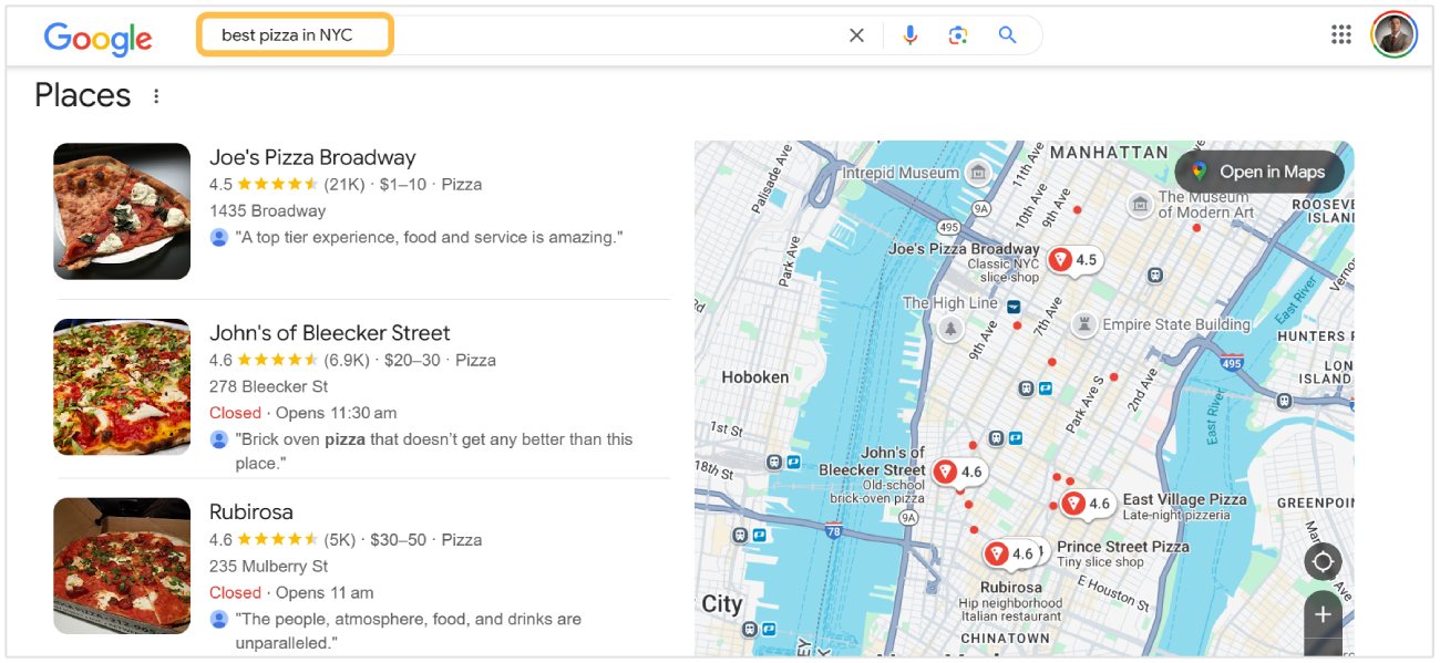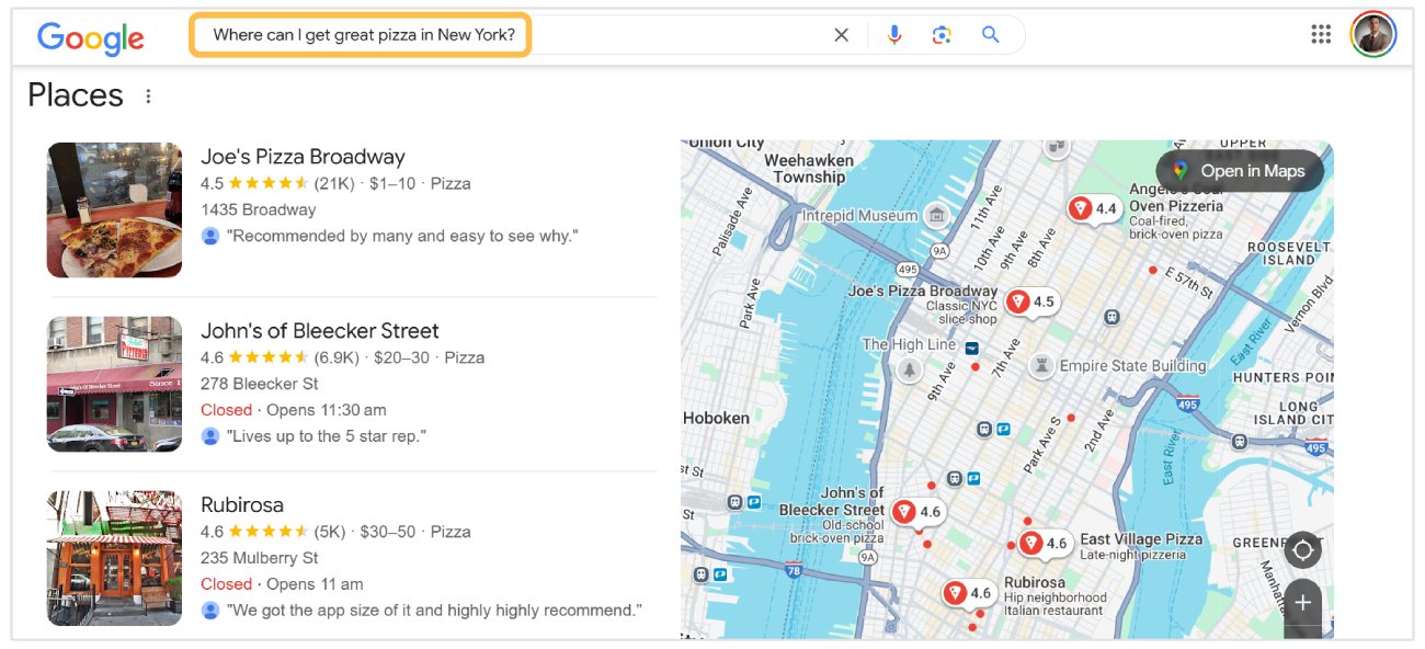 Las entidades ayudan a Google a conectar los puntos. En lugar de depender solo de palabras clave, Google observa el panorama general. Entiende que "New York" es una ubicación y "pizza" es un tipo de comida. También puede reconocer restaurantes de pizza específicos como entidades.