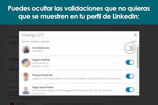 Para LinkedIn (copio lo que dice literalmente en su ayuda) las validaciones de aptitudes son un magnífico modo de reconocer las aptitudes de tus contactos de primer grado con un sólo clic de ratón. También permiten a tus contactos validar tus áreas de dominio en el perfil. Las validaciones de aptitudes son un modo sencillo y eficaz de crear tu marca profesional y de hacer participar a tu red.