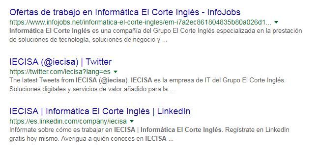 Aquí tenéis un ejemplo al buscar la marca “IECISA”, una empresa B2B del sector informático. Los 3 siguientes resultados a su página son los perfiles sociales que utiliza: Infojobs, Twitter y LinkedIn.