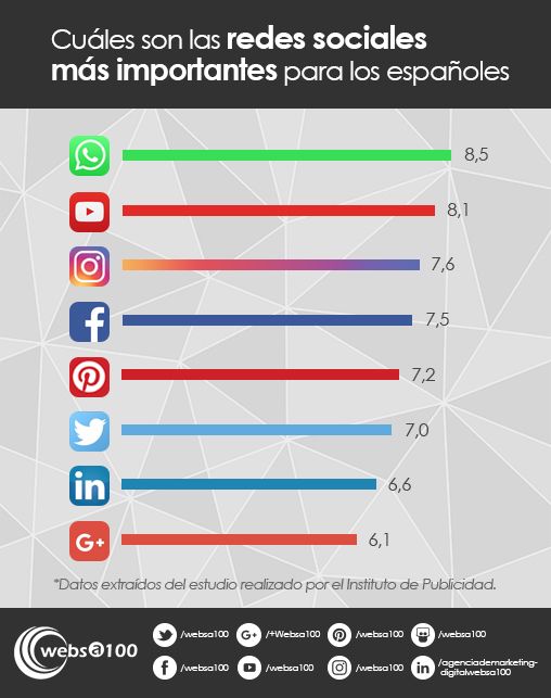 Es precisamente Whatsapp una de las redes sociales más importante para los españoles, ya que encabeza la lista con un 8.5 (¡casi un sobresaliente!). Le sigue Youtube e Instagram. En cuarto lugar aparece Telegram, otro servicio de mensajería instantánea. Seguidamente: Facebook, Pinterest, Twitter y LinkedIn. Por último, aparece Google + que cierra la lista.