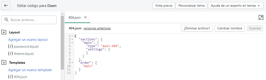 O personalizarla dirigiéndote al código real y seleccionar 404.json para realizar los cambios allí: