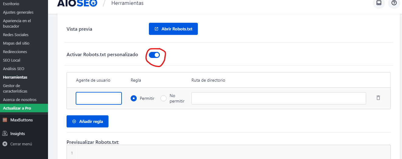 Para crear reglas avanzadas en tu archivo robots.txt, haz clic en el administrador de funciones y después en el botón de activación justo debajo de robots.txt.