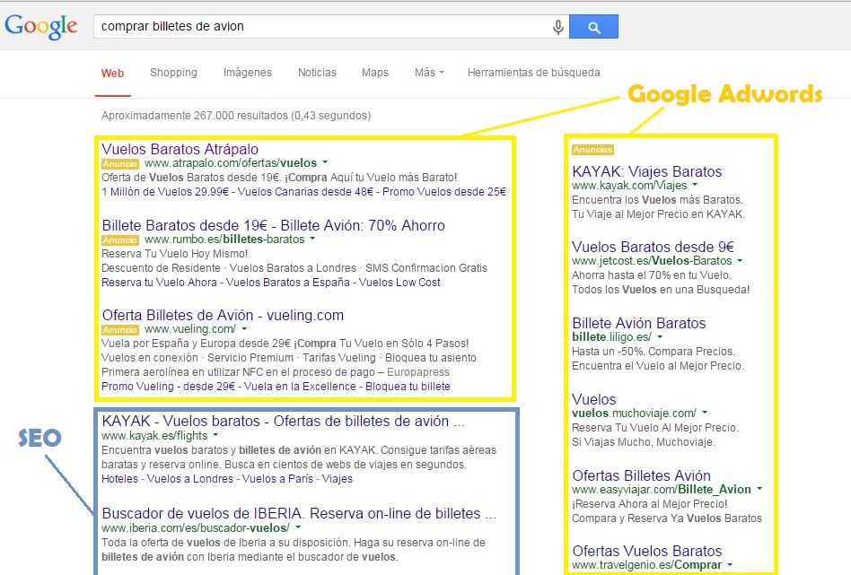 Los anuncios son los resultados que salen en Google en la parte superior cuando hacemos una búsqueda. Van acompañados de un cuadrito naranja con la palabra “ANUNCIO”. Como decíamos antes, estos siempre salen por encima de los resultados de SEO, por tanto tienen mayores posibilidades de ser clicados por el usuario. La redacción de los anuncios y la relevancia de los mismos con las palabras clave, también suele ser uno de los errores más garrafales en una campaña de Adwords, sin embargo, se trata de uno de los aspectos más importantes y una de las respuestas clave a la pregunta de cómo salir en google en las primeras posiciones.