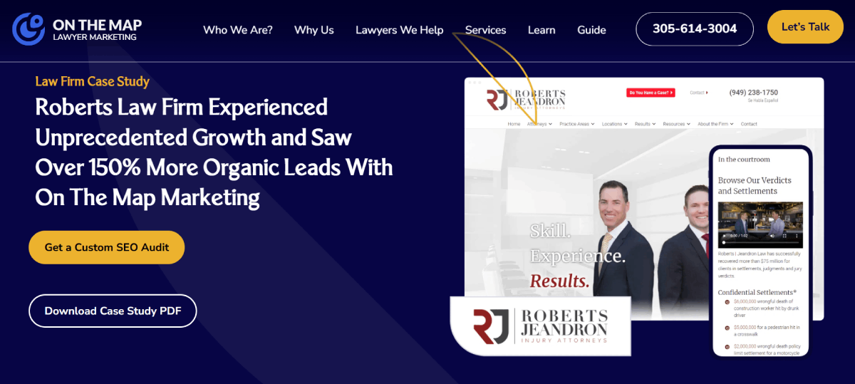 Por ejemplo, si tienes un bufete de abogados, busca estudios de caso sobre cómo la agencia de SEO ayudó a clientes anteriores en la industria legal como el que se muestra en la captura de pantalla a continuación.