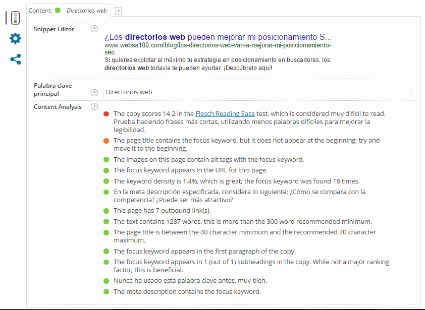 Se basa en un sistema por colores muy intuitivo que señaliza la calidad de cada uno de los textos, ofreciendo el verde para una buena optimización, el amarillo para una optimización a medias y el rojo para una mala. El problema de este plugin de SEO para WordPress es básicamente que es él mismo el que decide si el texto esta optimizado o no y, aunque tengas un buen texto para SEO, no tienen por qué aparecerte todas las señales en color verde. Una de las recomendaciones que te dice el plugin de SEO by Yoast, que siempre te aparecerá en rojo, será la dificultad de la lectura, si escribes textos en español. Esto se debe a que el plugin está optimizado para la lengua inglesa y siempre te dirá que la estructura de los textos es muy compleja, y eso es un factor en su contra.