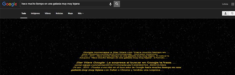 Por último, han elaborado un nuevo easter egg , una de tantas divertidas sorpresas que oculta el buscador a sus usuarios, que se activa si buscas en Google la famosa primera frase con la que empiezan todas las películas de la saga: “ Hace mucho tiempo en una galaxia muy muy lejana…”. Está claro que Google quiere que la fuerza nos acompañe en nuestro viaje por la red.