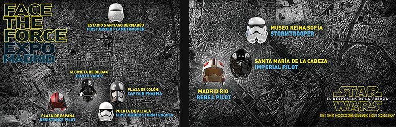 Son muchas las campañas de Street Marketing que ha puesto en marcha Star Wars en todo el mundo, pero me gustaría destacar una que ha tenido lugar en Madrid, desde el Del 31 de octubre al 30 noviembre de 2015. Estoy hablando de la exposición al aire libre “Face the Force”. Gracias a esta iniciativa de Disney y el Ayuntamiento de Madrid, la fuerza se apoderó de diversos espacios públicos de la ciudad. Concretamente, un total de ocho réplicas gigantes de los cascos de algunos de los personajes del universo Star Wars se repartieron en distintas ubicaciones que se dieron a conocer a través de la cuenta oficial de Twitter. Cuatro de los cascos pertenecen a personajes de las películas antiguas, y otros cuatro a la nueva trilogía que se estrena con el episodio VII. Los lugares que han acogido esta exposición recibieron miles de visitas de viandantes y seguidores de la saga deseosos de fotografiarse con los famosos cascos.