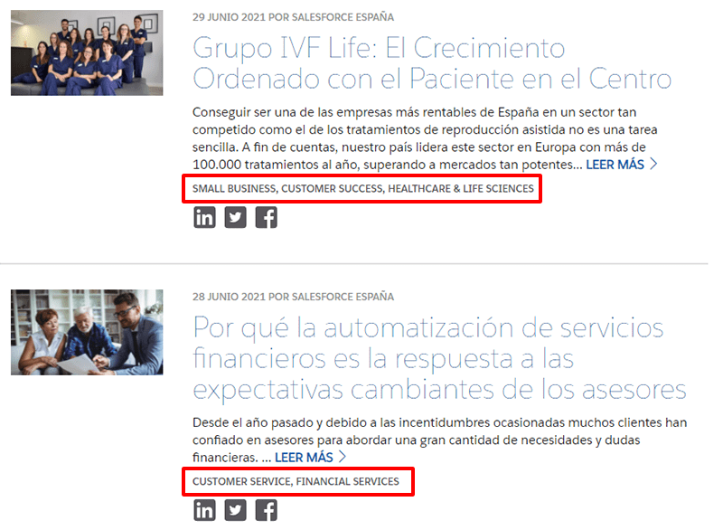 A continuación puedes ver un ejemplo de taxonomía web que ayuda a conectar a los usuarios para que lean otros artículos relacionados con lo que están leyendo:
