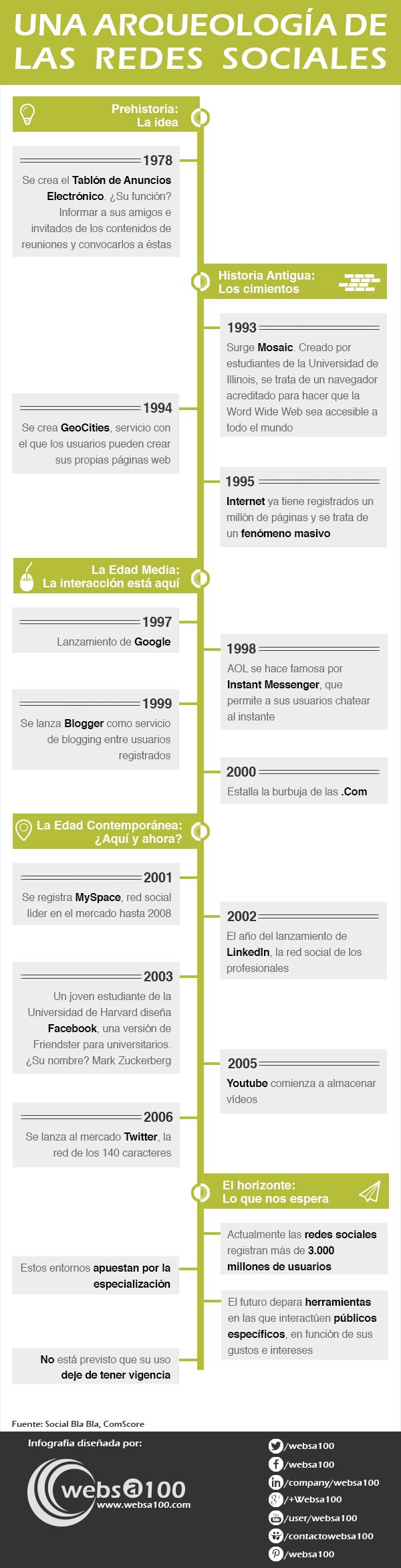 Es lo que os proponemos en la siguiente infografía, que hemos elaborado en nuestra agencia de marketing online, websa100. En ella, podréis observar la evolución de estas herramientas así como de su roca madre: Internet.