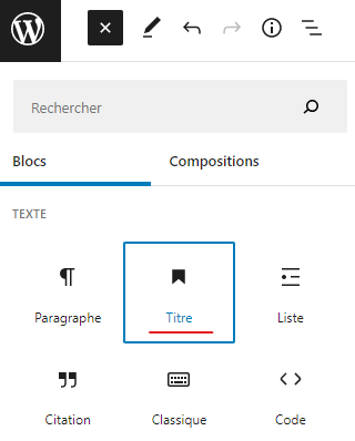 Pour ajouter la balise H1 dans WordPress, il suffit de cliquer sur l'icône « + » de l'éditeur Gutenberg et de cliquer sur l'option « heading » comme le montre l'image ci-dessous :