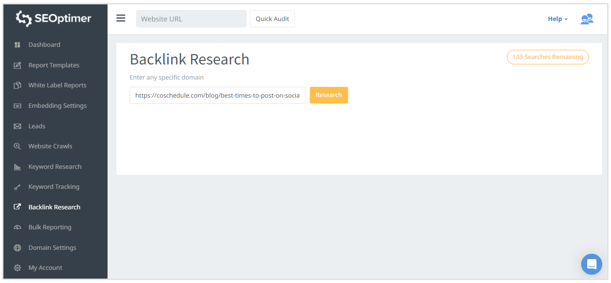 Maintenant que vous avez identifié un concurrent, il est temps de le mettre sous le microscope. Dans l'onglet « Recherche de backlinks » de SEOptimer, ajoutez simplement le domaine d'un concurrent et cliquez sur "Recherche".