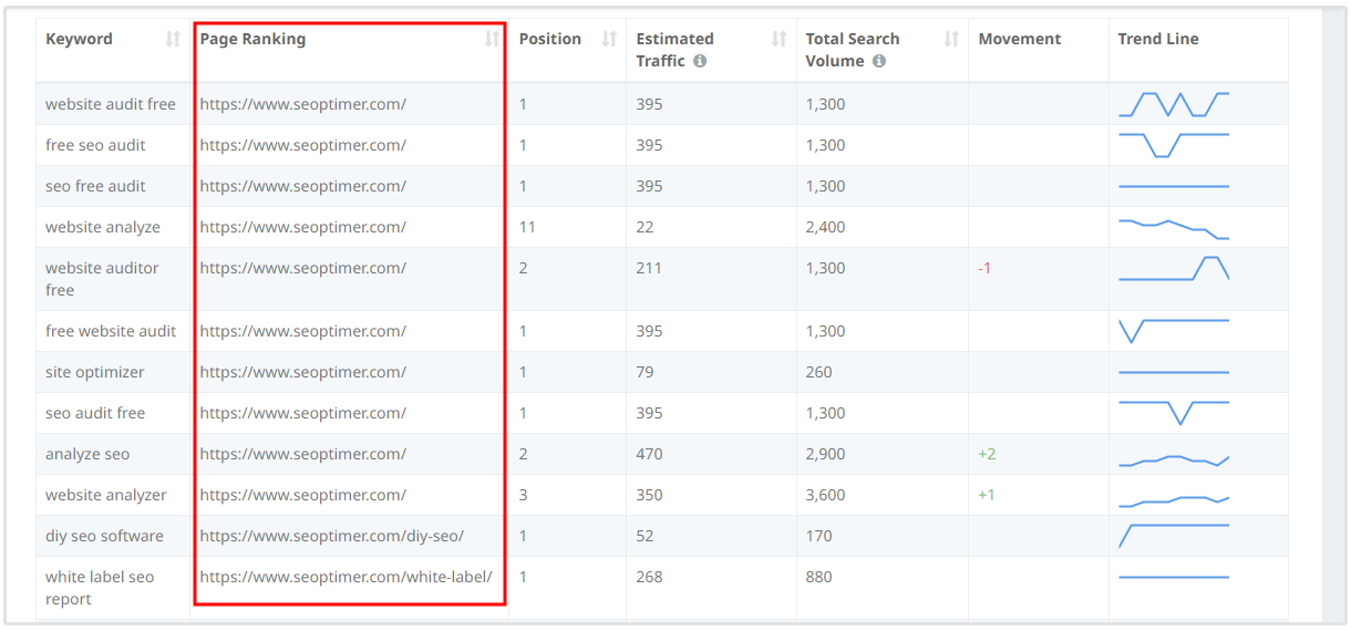 Chez SEOptimer, vous pouvez également consulter des métriques importantes concernant les mots-clés pour lesquels vous êtes déjà classé.