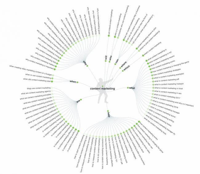 Commencez vos recherches avec des outils de recherche de mots-clés. Supposons que vous souhaitiez créer une page centrale sur le « marketing de contenu ». Ainsi, vous pourriez utiliser quelque chose comme AnswerThePublic pour obtenir les principales questions autour du sujet.