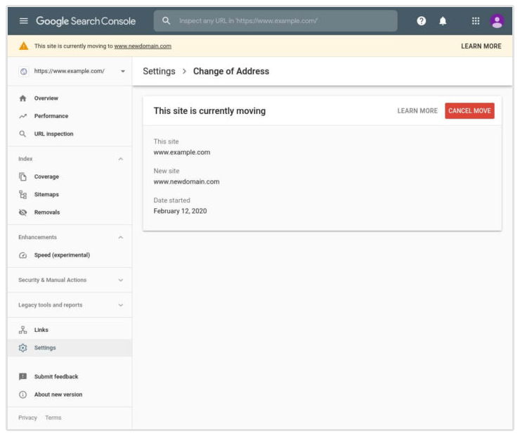 Une fois que vous avez ajouté votre nouveau domaine en tant que propriété dans Google Search Console, utilisez l'outil de changement d'adresse pour informer Google de la migration du domaine.