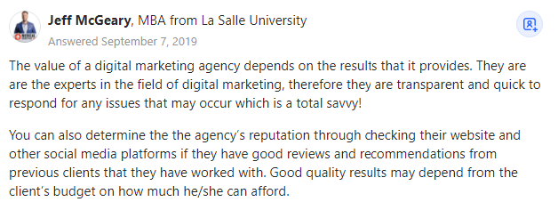 Le fondateur de l'agence, Jeff McGeary, suggère que la valeur d'une agence de marketing numérique repose sur les résultats qu'elle fournit :