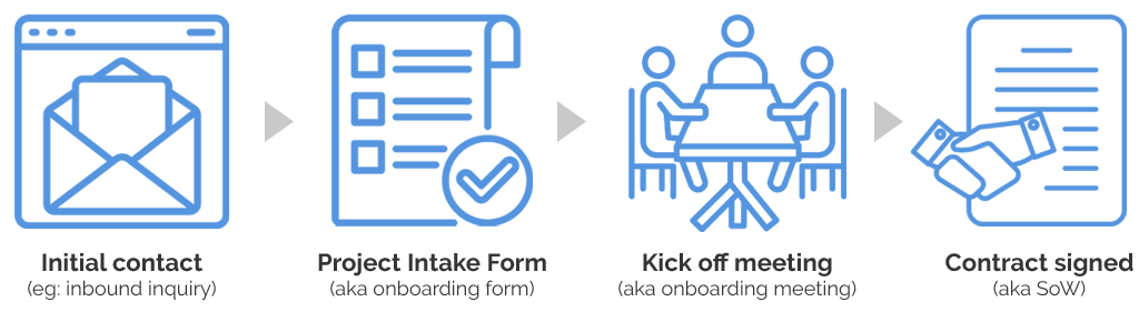 Le formulaire de prise en charge du projet représente généralement une partie d'un processus d'accueil d'un nouveau client en 3 ou 4 étapes. Selon le type (et la taille) de votre agence, le processus d'accueil (ou d'intégration) d'un nouveau client pourrait ressembler à ceci :