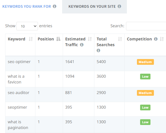 Maintenant, lorsque vous cliquez sur le classement des mots-clés sur votre tableau de bord, vous pouvez voir la position des mots-clés ainsi que le trafic estimé.