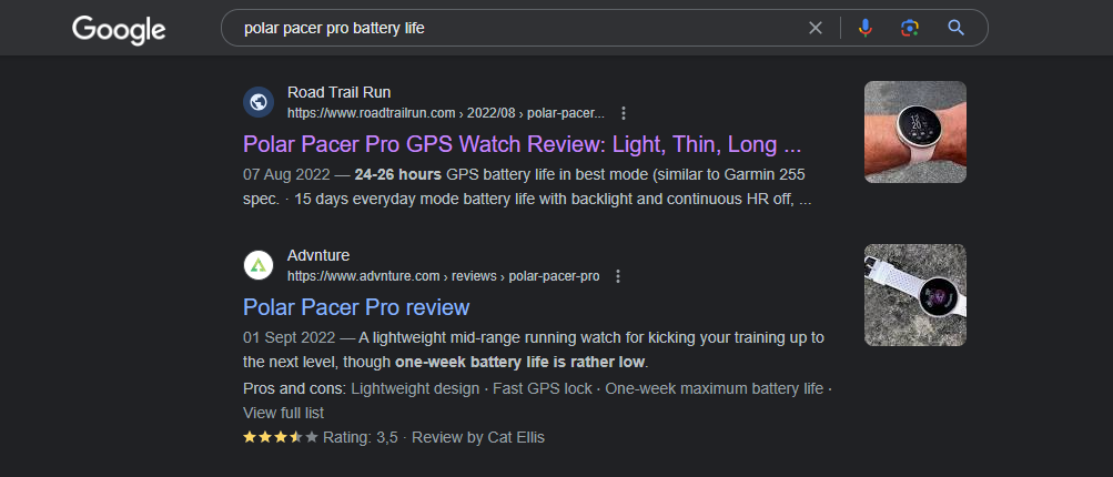 Par exemple, la requête de recherche "autonomie de la batterie de la polar pacer pro" sera probablement utilisée par quelqu'un qui est intéressé par l'achat de cette montre, mais qui veut connaître son autonomie de batterie et d'autres spécifications techniques clés. Il est probable que les pages se classant pour cette requête de recherche soient des critiques de produits qui détaillent des aspects tels que l'autonomie de la batterie, le design, les fonctionnalités, etc.