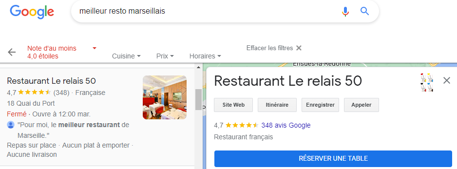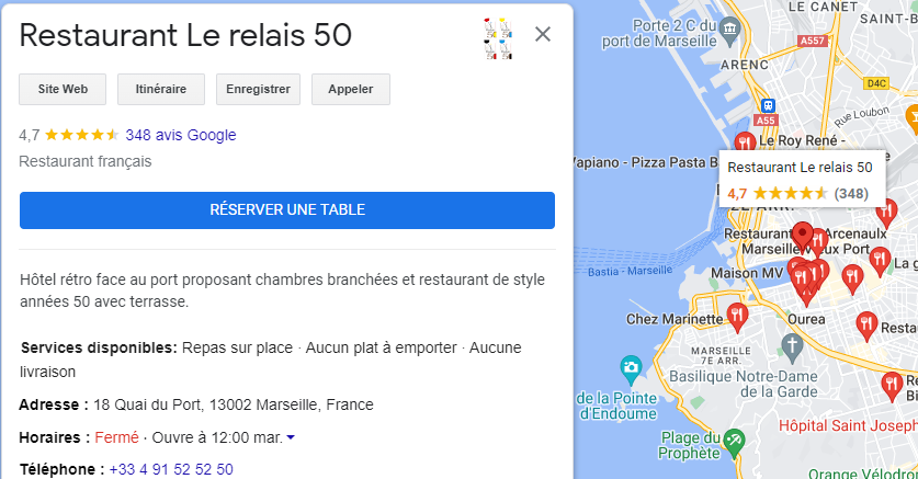 Qu'est-ce que votre fiche Google My Business ? Il s'agit de la fiche qui apparaît lorsqu'une personne recherche votre restaurant (ou les restaurants de la région) sur Google ou Google Maps. Voici à quoi ressemble cette fiche :