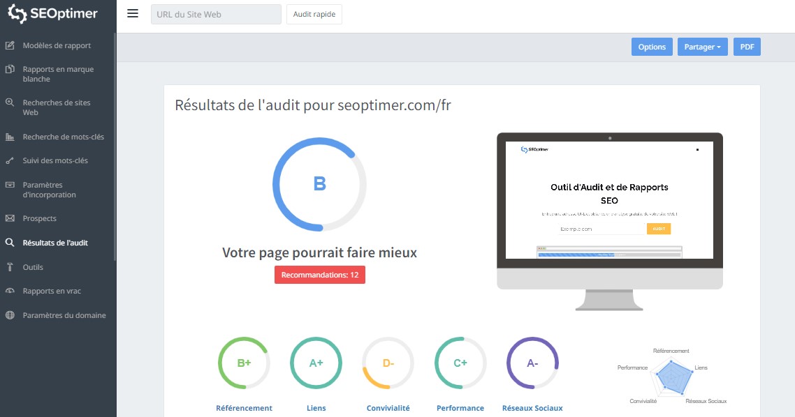 Cet outil est exceptionnellement simple à utiliser : il suffit d'entrer l'URL de votre site Web pour qu'il effectue un audit complet de votre site. Après avoir identifié les problèmes de votre site, l'outil vous recommandera une liste de solutions (et vous expliquera comment les mettre en œuvre).