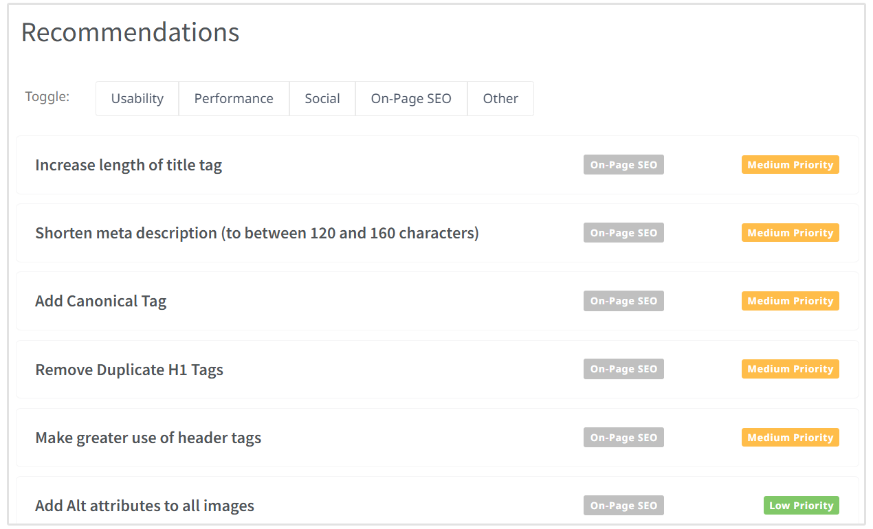 Vous pouvez également voir diverses recommandations sur la page uniques à votre site web sur lesquelles vous pouvez travailler pour améliorer les performances de recherche organique de votre page d'accueil.