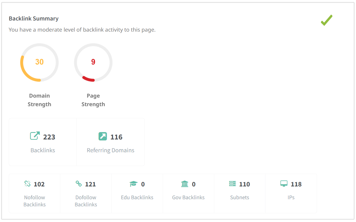 Avec chaque rapport que vous exécutez, vous verrez une analyse de [backlink] de votre domaine montrant la [Force du Domaine], la [Force de la Page], le nombre de [backlinks], le nombre de liens [dofollow], et le nombre total de domaines référents pointant vers la page d'accueil.