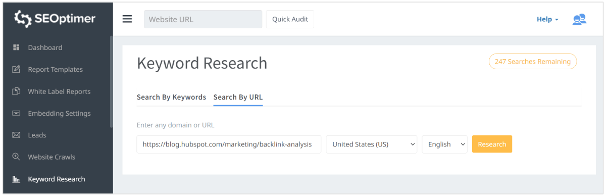 Vous pouvez également identifier le mot-clé principal que vos concurrents ciblent en utilisant l'outil de mots-clés SEOptimer. Il suffit de choisir l'option Search By URL et d'entrer le domaine dans la barre de recherche, et l'outil affichera le mot-clé et les URLs des pages.
