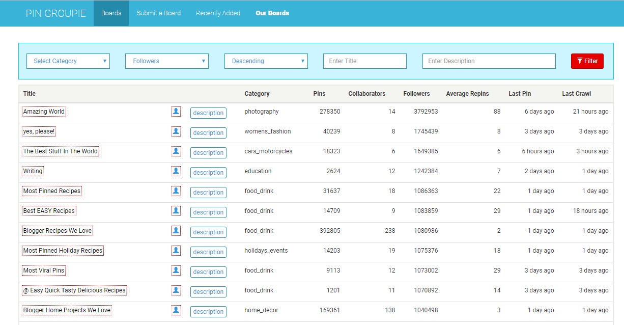 Pour ce faire, rendez-vous sur PinGroupie et trouvez les tableaux les plus pertinents liés à votre sujet. Filtrez les résultats selon la catégorie, les abonnés, le titre et la description. Rejoignez autant de tableaux que possible afin de pouvoir épingler votre contenu là-bas.