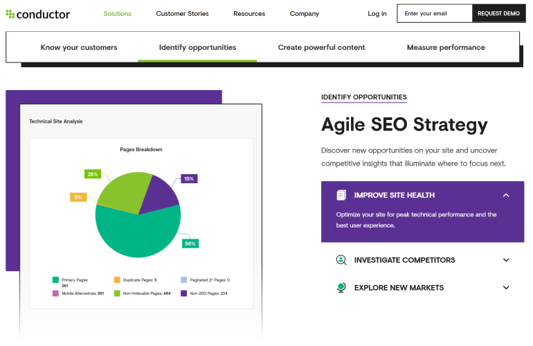 Conductor est à la fois un logiciel et un service capable de fournir la technologie ainsi que d'interpréter les résultats et de fournir une stratégie SEO. Conductor dispose d'une équipe d'analystes qui peut également aider à exécuter des requêtes spécifiques ou répondre à des questions relatives aux données SEO.