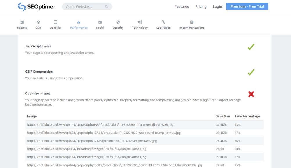 Il est important d'optimiser vos images pour le web également. Aujourd'hui, plus de la moitié de vos visiteurs naviguent sur votre site depuis un appareil mobile. Les images volumineuses se chargent lentement sur mobile, alors compressez toujours vos images avec des outils comme TinyPNG ou TinyJPG. Si vous avez déjà un site web fonctionnel, vous pouvez également utiliser SEOptimer pour trouver les images qui nécessitent une optimisation. Vous devez simplement exécuter l'outil de rapport de SEOptimer et descendre jusqu'à la section "Optimize Images" où vous trouverez une liste d'images mal optimisées.