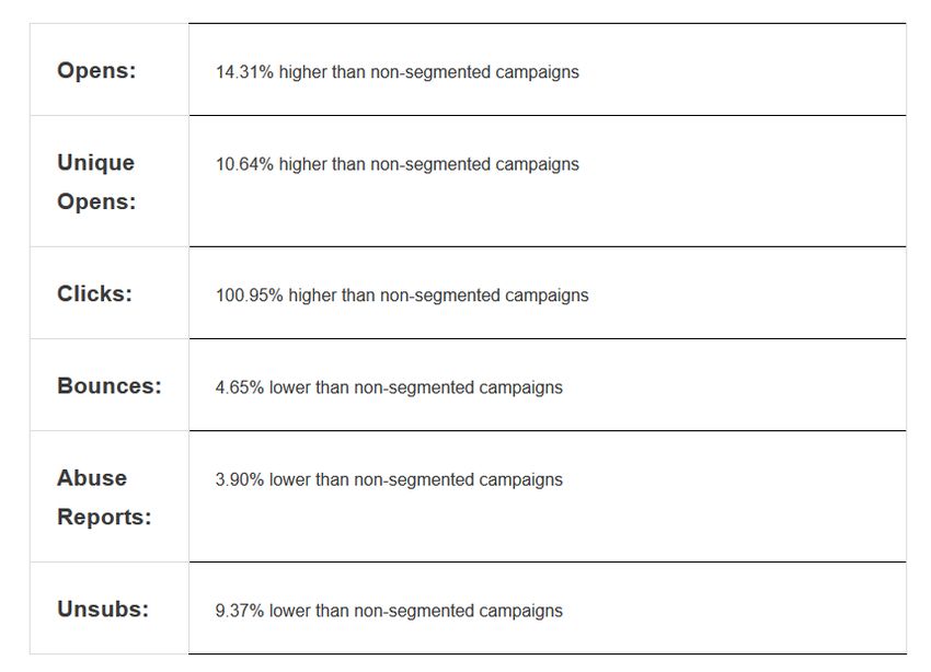 Les campagnes de newsletter sont l'une des méthodes les plus populaires du marketing digital. Il existe un certain nombre d'outils d'email marketing allant de MailChimp à Email Octopus avec lesquels vous pouvez automatiser vos campagnes. Ces dernières années, cependant, les boîtes mail des gens sont devenues surchargées de newsletters (souvent non sollicitées). Ainsi, les marketeurs par email doivent trouver des moyens de ne pas être perçus comme des spammeurs et d'attirer l'attention de leur public. Segmenter les listes de marketing par email est une méthode éprouvée pour augmenter les taux d'ouverture et de clic. Ci-dessous, vous pouvez voir les résultats de La recherche de MailChimp à propos du succès des campagnes de newsletters segmentées :